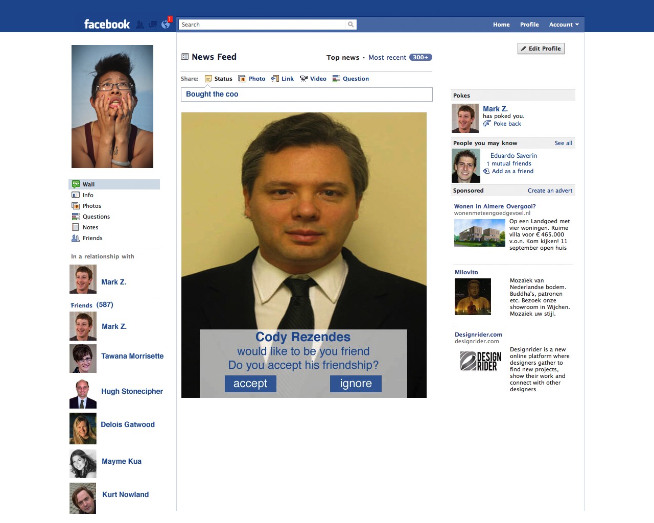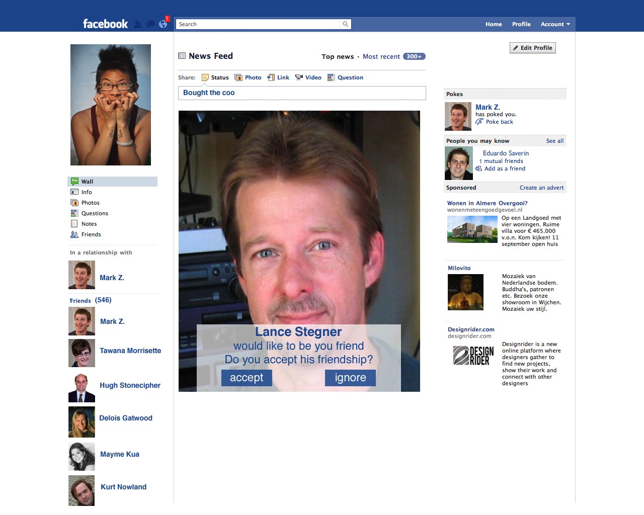 With the aid of a Disklavier, electronics, video and the soprano Stephanie Pan, de Graan tells a story of a woman named Erica Albright, who comes in contact with Facebook for the first time. In the course of the story, Erica loses herself in her virtual social scene, but soon discovers that it isn't all that she thought it to be.